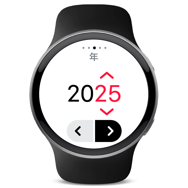 赤い矢印をタップして年を設定し、次 icon-next-button.svg をタップして日付を設定します。