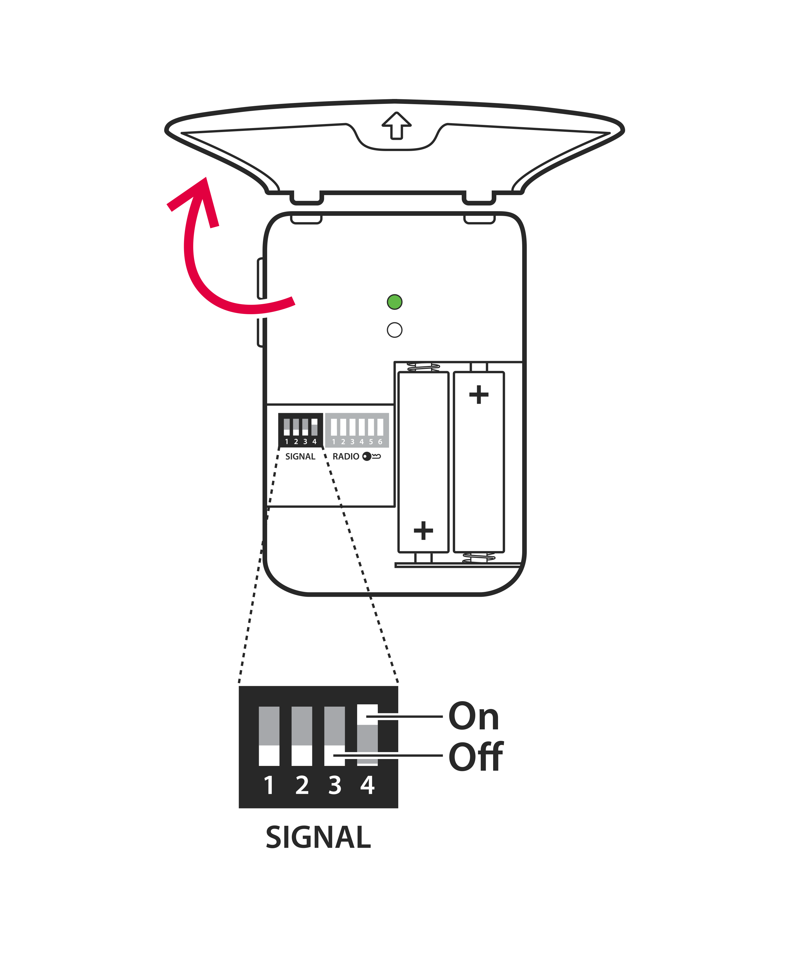 Lähetin ohjaa Visit-vastaanottimien signaalimallia. Jos haluat vaihtaa signaalimallin, avaa lähettimen etukansi ja siirrä signaalikytkimiä seuraavan taulukon mukaisesti: