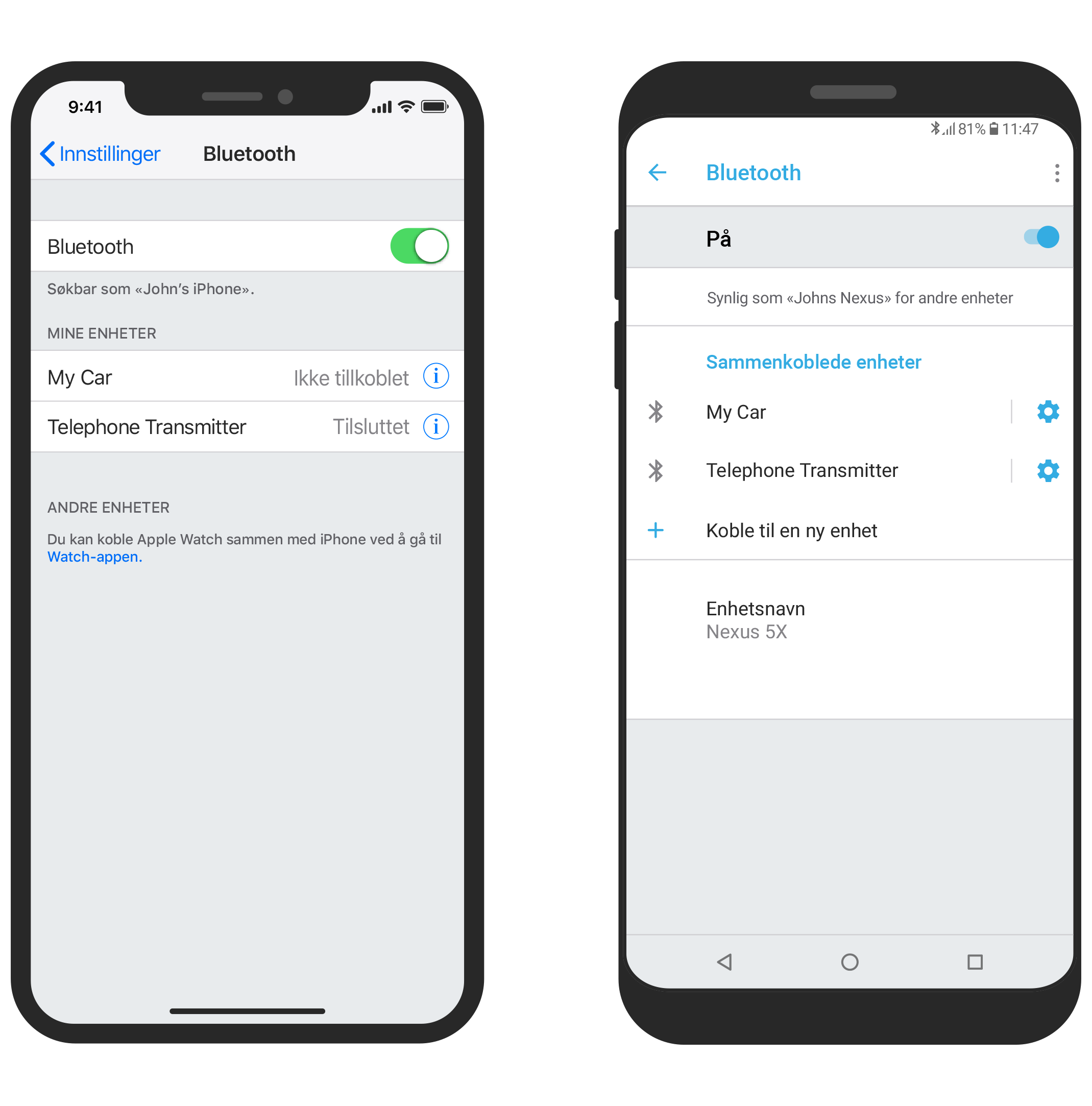 Gå til Innstillinger > Tilkoblinger. Trykk på Bluetooth og finn Telephone Transmitter i listen over parkoblede enheter. Trykk på tannhjulikonet og trykk Koble fra.