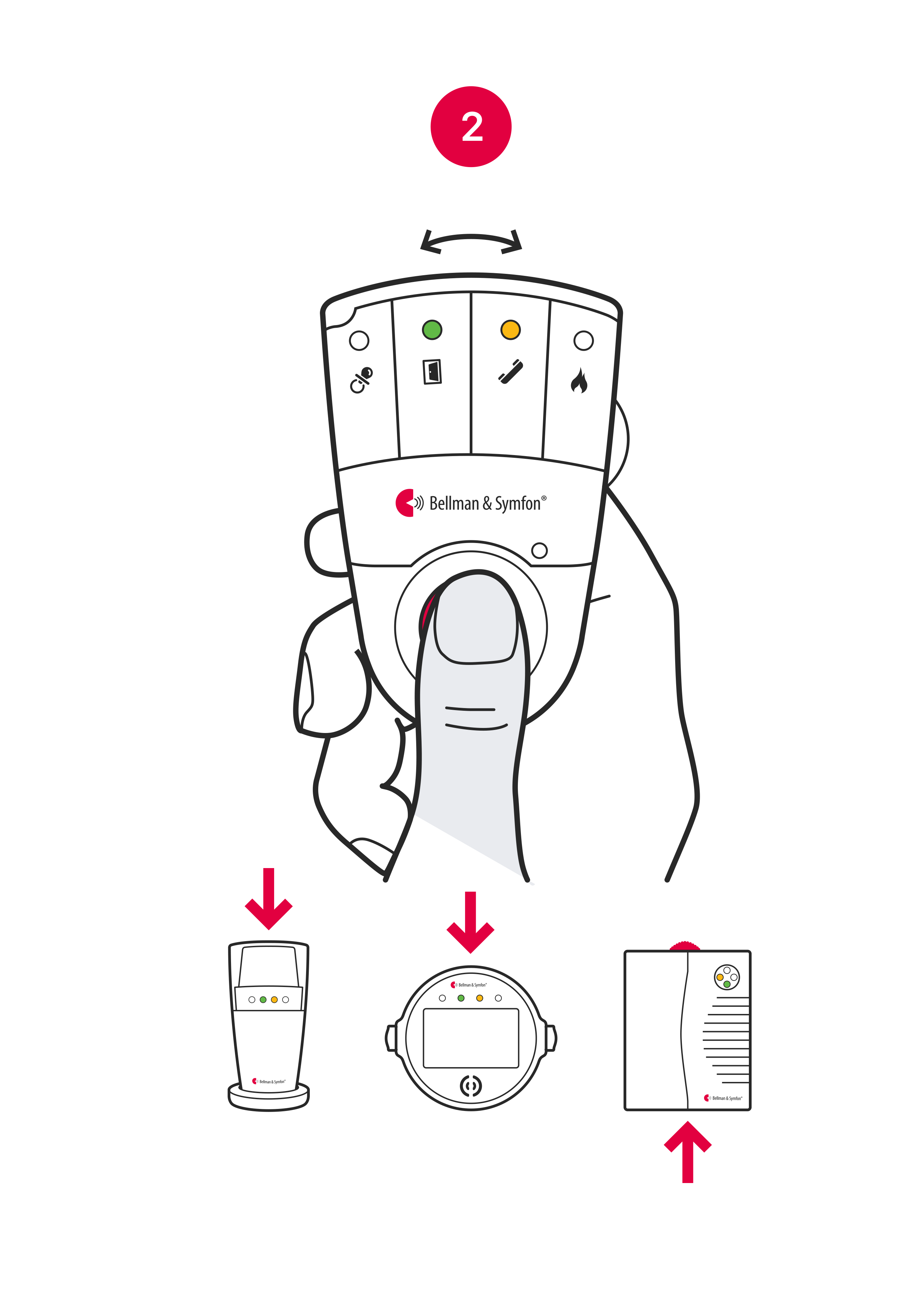 - Nyomja meg és tartsa lenyomva a teszt/funkció gombot a vevőkészüléken, amíg a zöld és a sárga Visit LED felváltva villogni kezd. Engedje el a gombot.