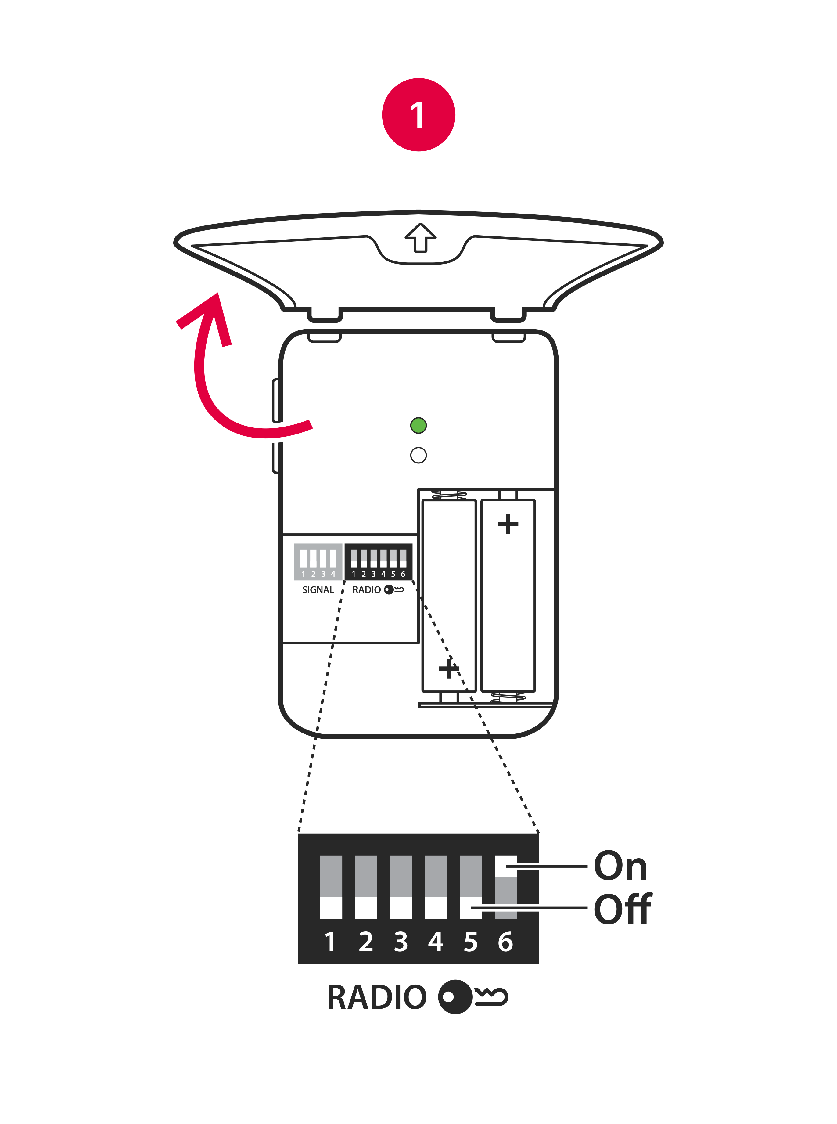- Nyissa ki az adó elülső fedelét, és állítsa valamelyik rádiókulcs-kapcsolót Fel = Be állásba a rádiókulcs megváltoztatásához. (Alapértelmezés szerint az összes rádiókulcs-kapcsoló Le = Ki állásba van kapcsolva.)