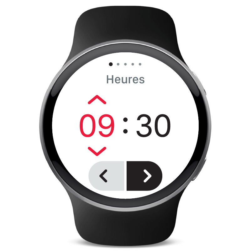 Sélectionnez les heures ou les minutes et appuyez sur les flèches rouges pour régler l'heure. Appuyez sur Suivant pour régler l'année.