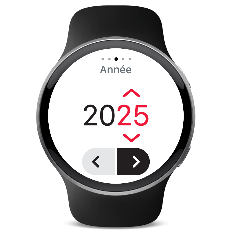 Appuyez sur les flèches rouges pour régler l'année, puis appuyez sur Suivant pour régler la date.