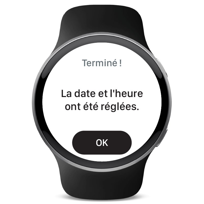 Un écran apparaît pour confirmer que la nouvelle date et heure ont été définies. Appuyez sur OK pour revenir à l'écran Paramètres.
