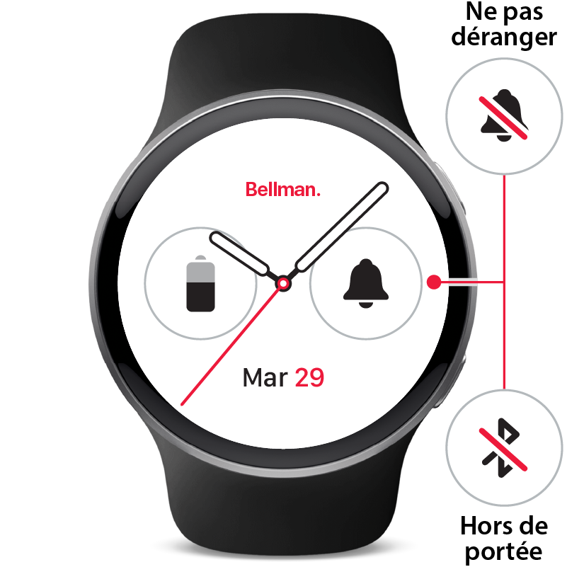 Le récepteur de votre montre vous propose plusieurs cadrans au choix. Quel que soit le design que vous choisissez, la montre affiche trois complications: la date, l'état de la batterie et l'historique des notifications. Toutefois, si la montre est hors de portée ou si les notifications sont désactivées, des symboles rouges apparaissent temporairement à leur place pour vous avertir.