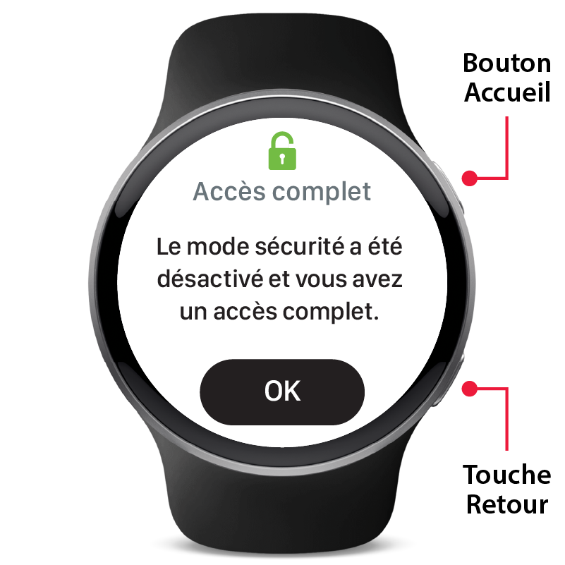 Maintenez la touche Accueil enfoncée tout en appuyant cinq fois sur la touche Retour. Appuyez sur OK pour revenir au cadran de la montre.