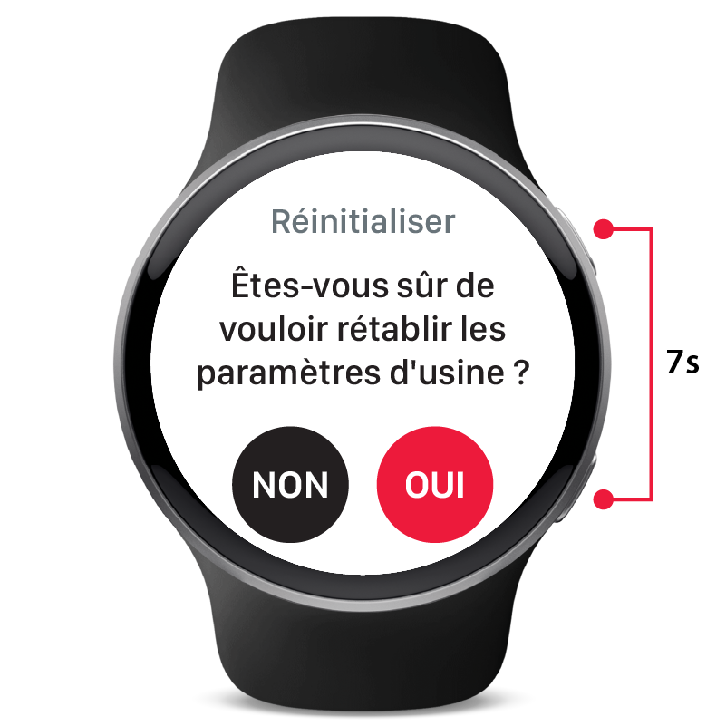 Maintenez les deux touches enfoncées pendant 7 secondes pour lancer une réinitialisation d'usine. Appuyez sur OUI pour confirmer. Les données d'appairage actuelles seront également supprimées.